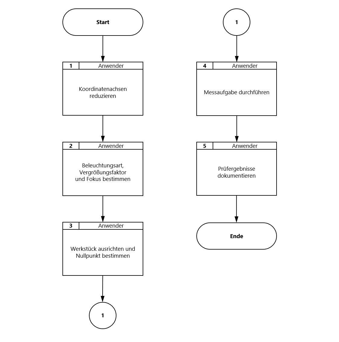 Die Inbetriebnahme des Videomessgeräts TESA VISIO 300 und die Durchführung einer Messaufgabe sind im folgenden Flussbild dargestellt. Eine detaillierte Anleitung zur Bedienung finden Sie in Anlage 1 und eine Erklärung einiger Funktionen in Anlage 2 dieser Arbeitsanweisung.